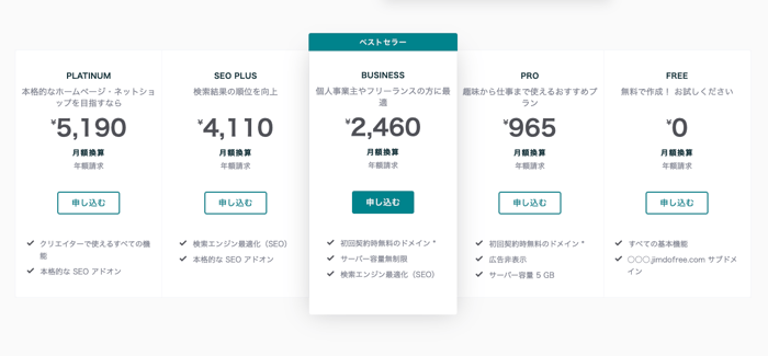今回新しく登場した2つのプランは、どちらも Business プランがベースとなっています。Business プランは、SEO を強化する上で重要な「ページタイトル」や「ディスクリプション(ページ概要)」をすべてのページで設定ができ、サーバー容量も気にせず使える1番ご好評のプランです。