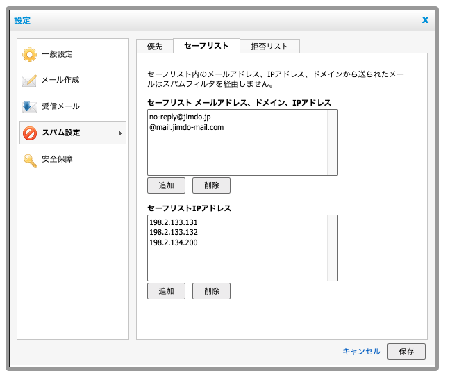- 「セーフリスト メールアドレス、ドメイン、IPアドレス」の「追加」ボタンをクリックし、
