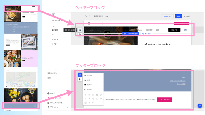 AI ビルダーで作成されたサイトの上部と下部に配置されているブロックで、全ページ共通で配置されるブロックです。上部のヘッダーブロックにはナビゲーション(ページへの移動メニュー)が含まれます。両方のブロックに共通して、ロゴ・SNSアイコンの掲示が行えます。