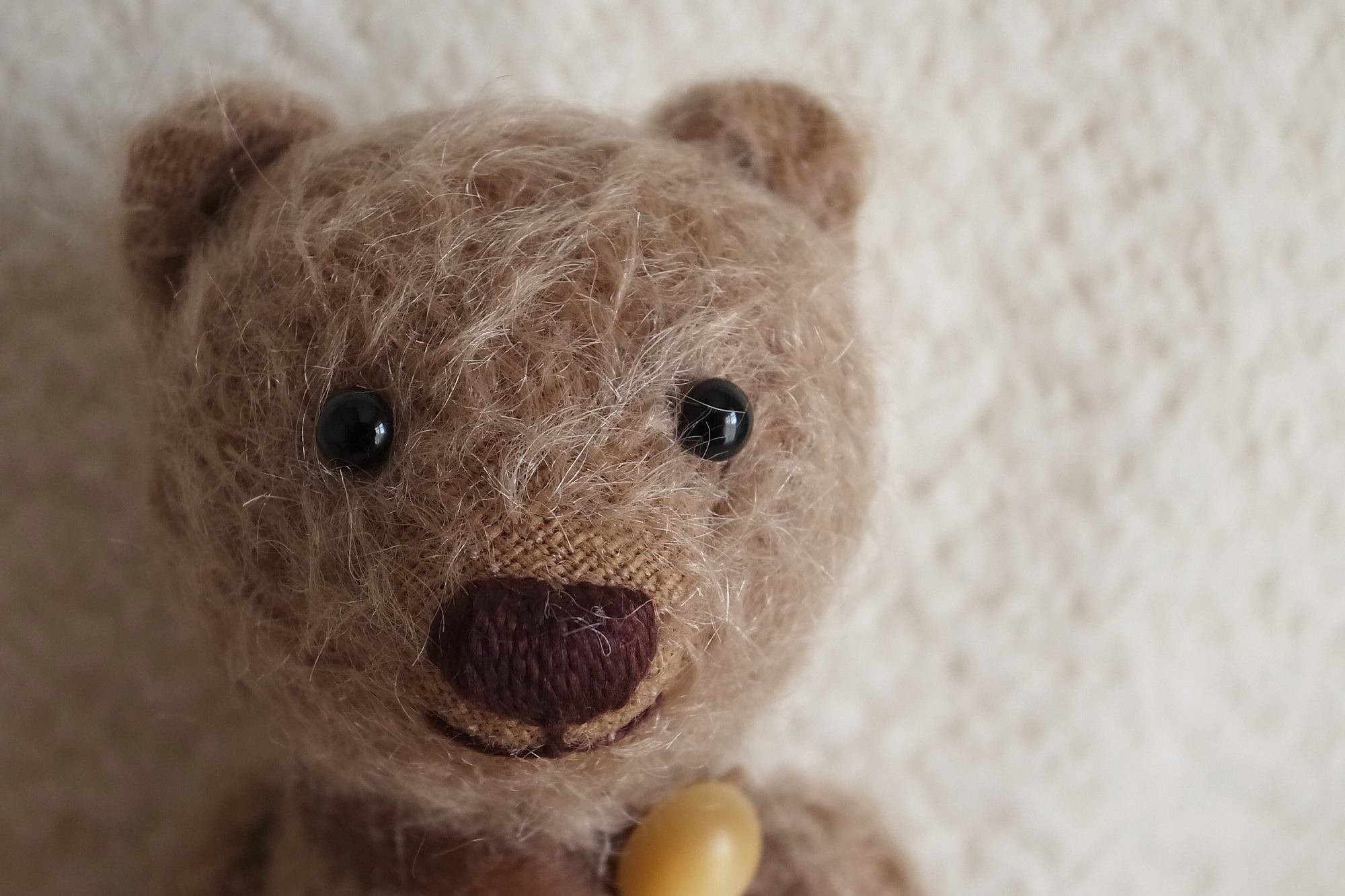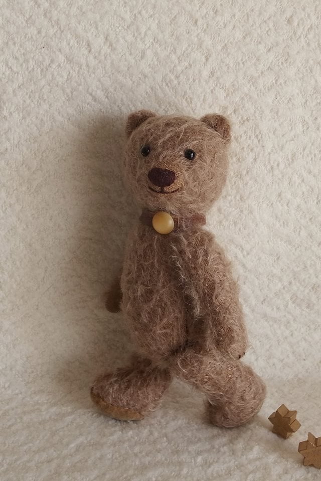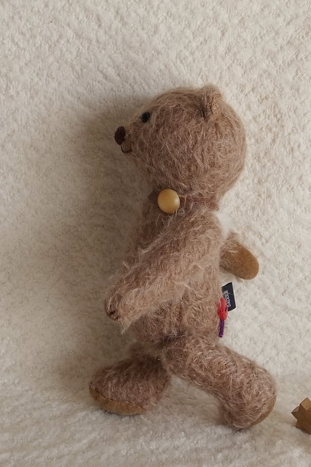 ヘーゼルブラウンのやさしい色合いが冬らしいヘーゼルくま 。くせっ毛のまばらな毛並みのモヘアで作られていて、見ても触っても、心を温めてくれるような存在です。毎年クリスマスの時期には、ぜひ帽子や巾着袋でサンタ仕様に着せ替えしてあげてください。