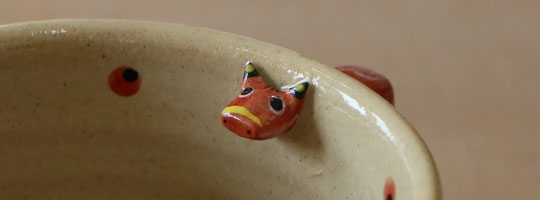 会津本郷焼は手作りの温かみがあります。ぐい呑の赤べこの胴体に指をかけると持ちやすく、わんめしも手に馴染みやすいです。