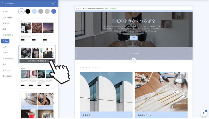 ブロックと呼ばれるデザイン要素を組み合わせていくだけで、プロが作成したようなホームページが作れるので、HTML や CSS などのコーディングスキルは必要ありません。