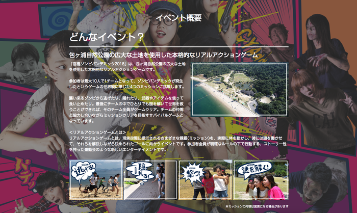 上記は、宮島ゾンビパンデミック2018 さんのイベントページの例です。イベントの内容を画像で表すことで、ゲームの内容やそのように進めるのかをイメージすることができます。