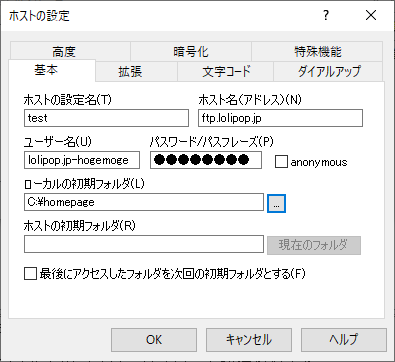 例:ロリポップサーバーの場合は、「ftp.lolipop.jp」を入力 -