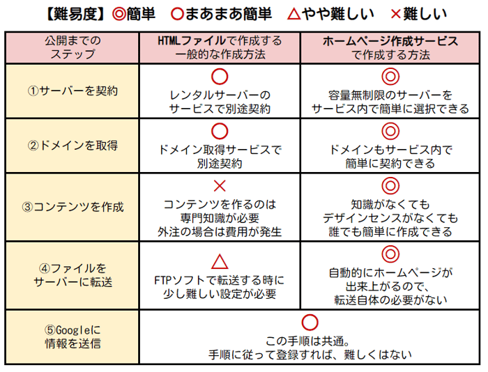 比較表を見れば、ホームページ作成サービスの簡単さが一目瞭然です。サーバーやドメインはサービス内で用意できますし、難しいコンテンツ作成もブラウザ上で超簡単に行えます。難しいサーバー転送も全く必要ありません。