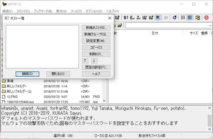 インストールが完了したら「FFFTP」を起動します。