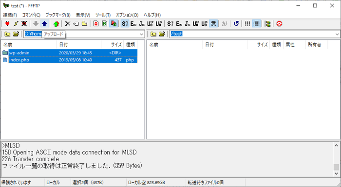転送には時間がかかりますが、「ファイルの一覧の取得は正常終了しました」と表示され、右側にもファイルが表示されれば転送完了です。