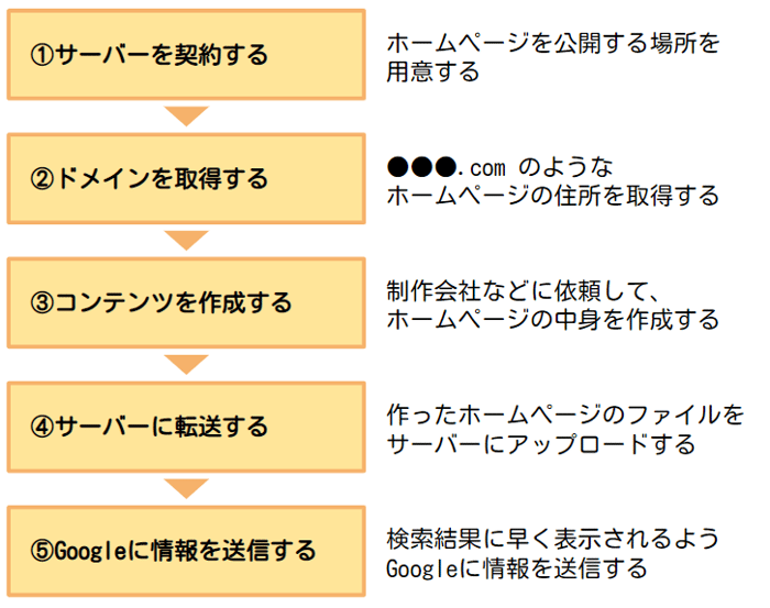 ホームページを公開するまでには、大きく分けて5つのステップがあります。