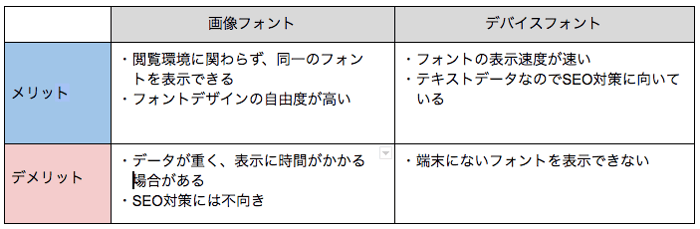 以下は、画像フォントとデバイスフォントのメリットとデメリットになる部分です。