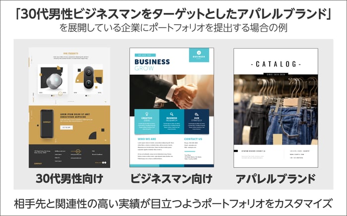 「30代男性」「ビジネスマン」「アパレルブランド」など、相手先の企業と関連性の高い実績が目立つようにポートフォリオをカスタマイズします。