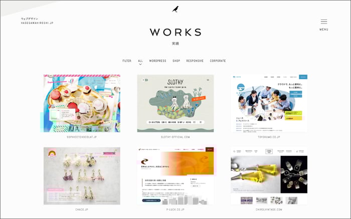 Webデザインを手がけるhasegawahiroshi.jpのポートフォリオサイトは、シンプルでセンスあふれるデザインが光ります。