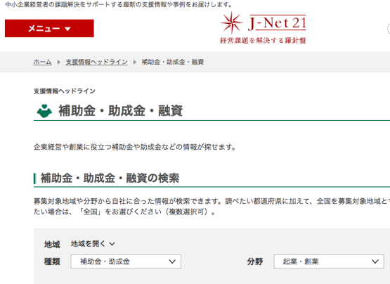 中小企業庁のサイトJ-NET21から、全国の補助金施策を探せます。年度開け〜初夏までに多くの情報が掲載される傾向にあります。