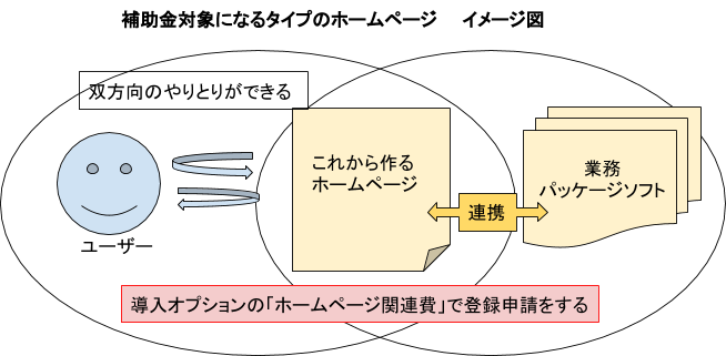 の条件を満たした時のみが、補助金の支給対象になります。業務パッケージソフトと一緒に、オプションとしてホームページ関連費で申請します。以下、カンタンなイメージ図がありますので参考にしてください。