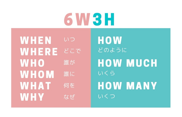 「6W3H」とは、When(いつ)、Where(どこで)、Who(誰が)、Whom(誰に)、What(何を)、Why(なぜ)、How(どのように)、How much(いくら)、How many(いくつ)のこと。