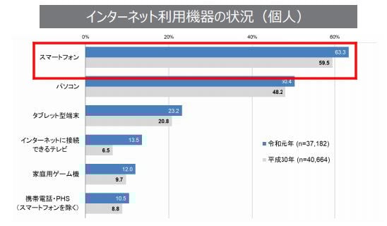 年々増加しているインターネット利用ですが、総務省による『通信利用動向調査(令和元年)』にも見られるように現在パソコンを抑えてスマホによるインターネット閲覧が最も多い状況にあります。