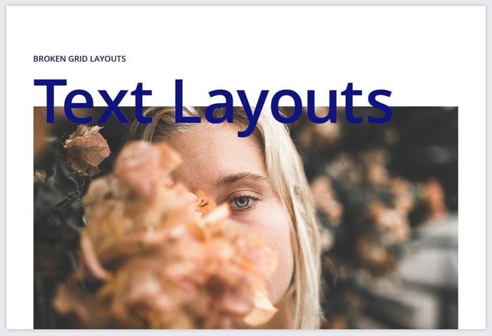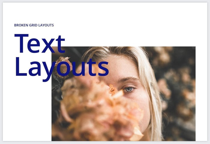そこで、グリッドの規則性からオブジェクトをずらすことによって、デザインに注目させることができ、リズムを与えることができます。具体的にずらすというのは、単純にテキストをずらしたり、テキストを重ねたり、写真とタイトルをずらしたりすることが挙げられます。では、これからその具体例を見ていきましょう。