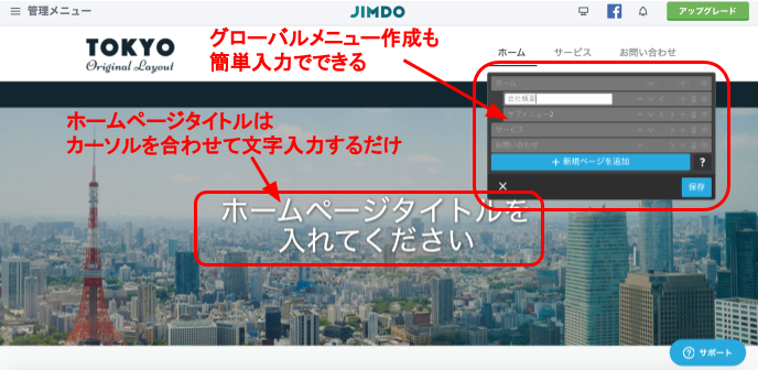 グローバルメニューも簡単な操作で作成できます。ホームページ作成に必要なCSSなどの知識も必要ありません。タイトルのほか、文字は入れたい箇所にカーソルを合わせればできます。