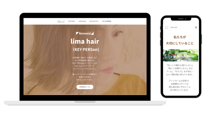 もともとWordPressで作成したホームページがあったのですが、お店の名前が「KEY PERSon」から「lima hair」へと変わり、新しい名前の認知やもろもろの情報変更が必要になったタイミングで、編集や修正もしやすいようにとジンドゥー AI ビルダーでサイトリニューアルを行いました。