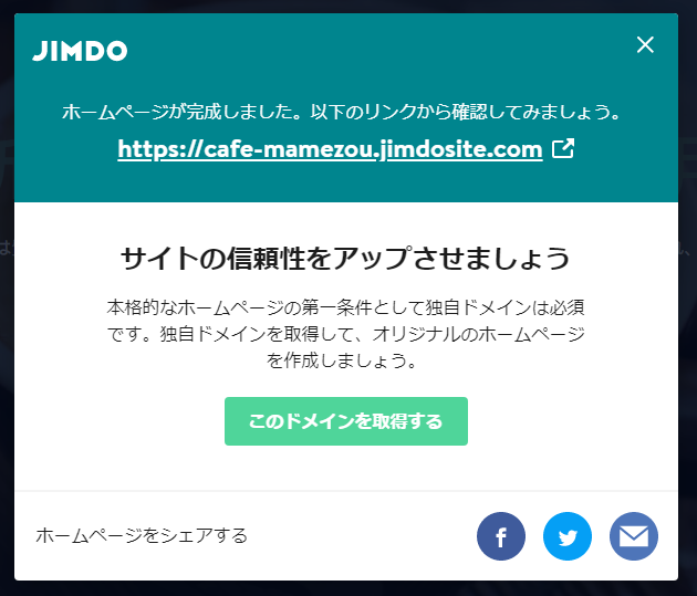 ちなみに、無料プランでは「https://●●●.jimdosite.com」というドメインになります(●●●の部分に任意のアルファベットを挿入することができます)。