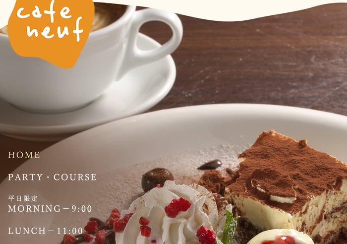「cafe neuf(カフェ ヌフ)」は、モーニングからディナーまで提供するお食事カフェです。このホームページで参考になるのは「ホームページの色使い」です。