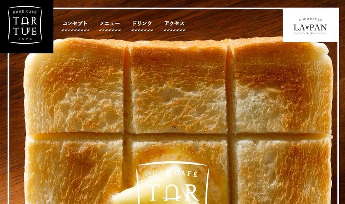 「GOOD CAFE TORTUE」は、口どけのよい食パンと食パンにマッチするサイドメニューが楽しめるカフェです。このホームページで参考になるのは「大胆なビジュアル訴求」です。