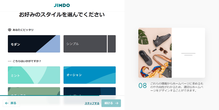 気に入ったデザインを選択したら、「好みのスタイル」→「色の組み合わせ」→「ホームページに盛り込みたい必要情報3つ」を選んでみましょう。