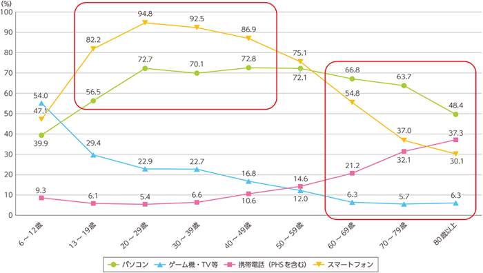 いまや日本国内のスマートフォン所有者は増加の一途をたどり、下記グラフによれば若い20代では94.8%、働き盛りの30代、40代ではそれぞれ92.5%、86.9%、シニア世代と言われる50代でも75.1%、60代でも半数以上の54.8%と、実に多くの人がスマートフォンを持っていることがわかります。