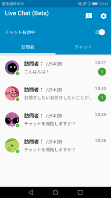 スマホの通知をオンにすると、ホームページに新たな訪問者が来た際にリアルタイムで通知を受け取ることができます。また夜間などの通知を受け取りたくない時間帯には設定画面から簡単に通知をオフにでき、必要に応じてチャットの無効化もスイッチひとつで可能です。