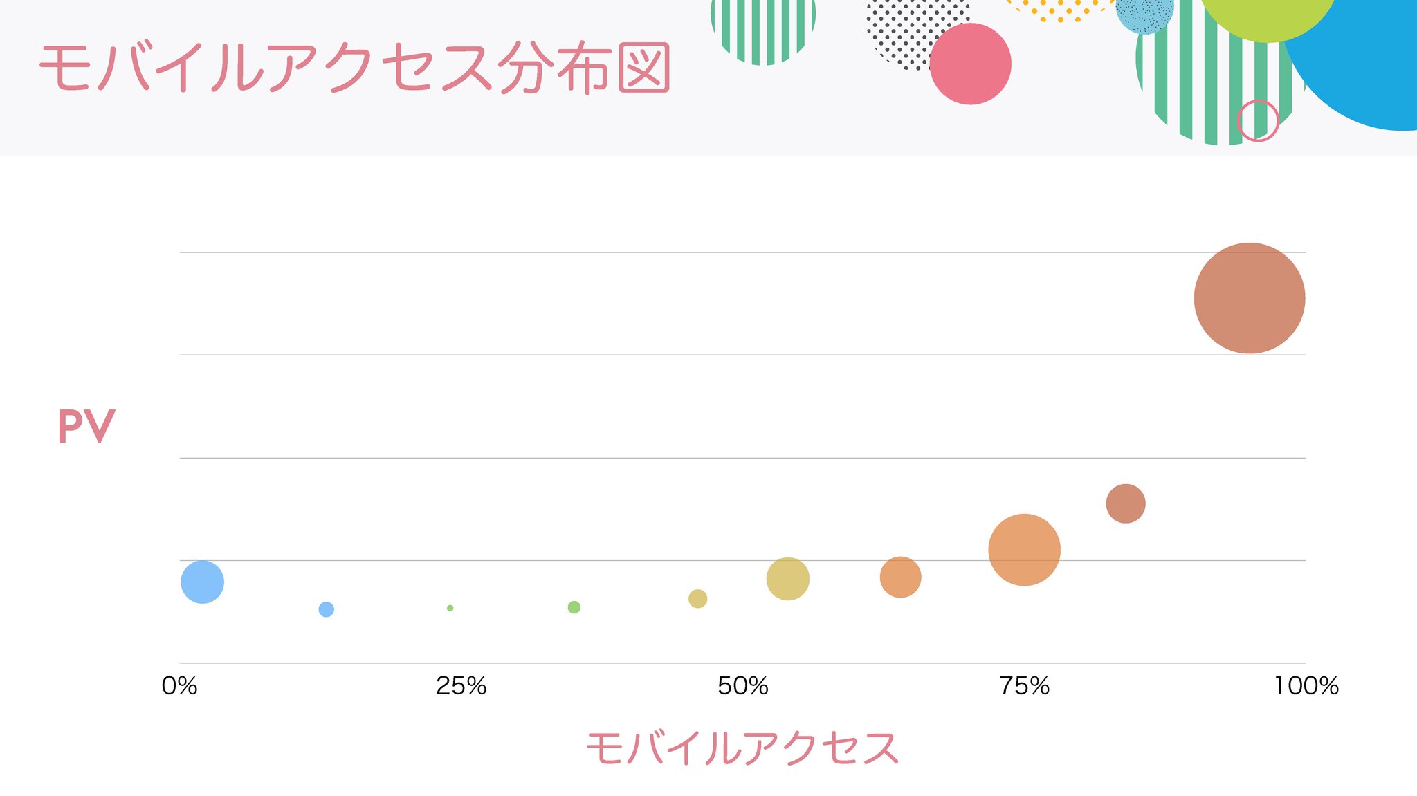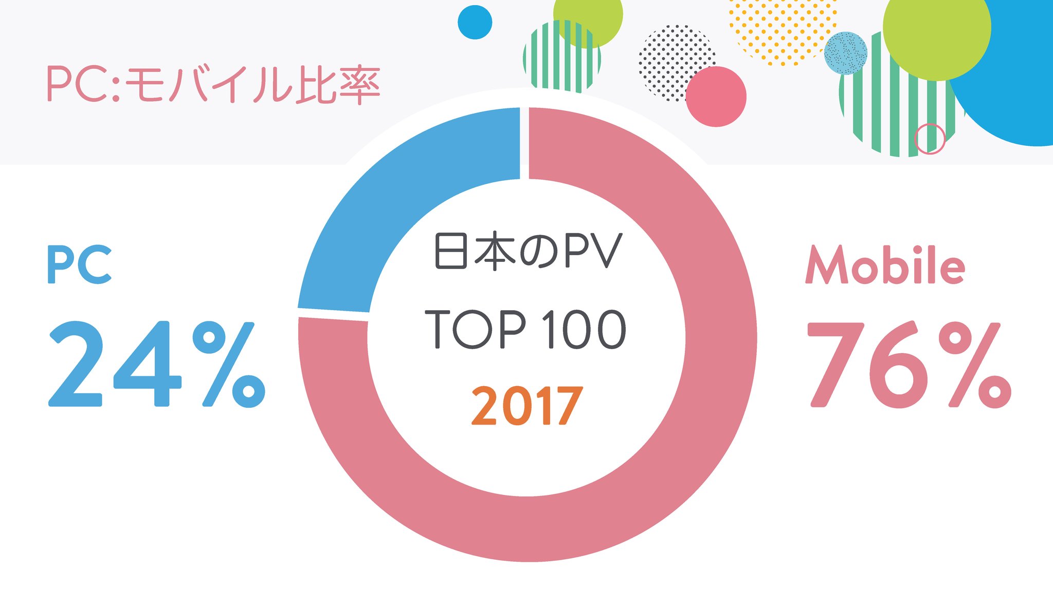 PV TOP100のPC/モバイル利用比率も、全体的にはわずか3年でモバイルがPCを逆転してしまいました。モバイルアクセス分布図の話は興味深く、スマホからホームページを見られることを意識すべきかどうかは、そのホームページ次第のところもあります。