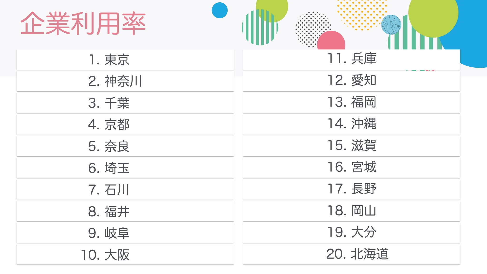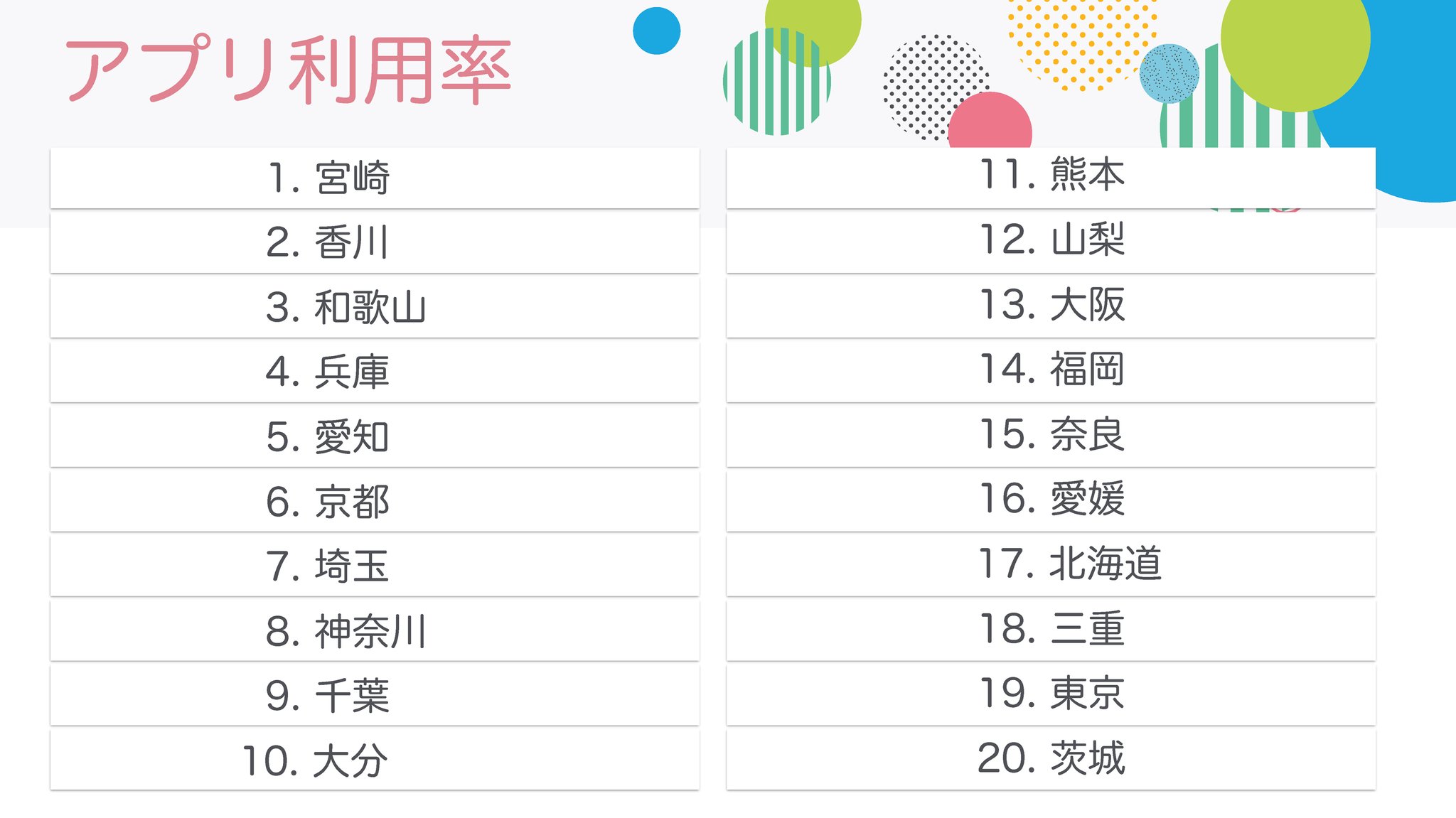 ユーザー数や企業利用率のTOP3などは何となく予想がつきやすいですが、アプリ利用率の宮崎県が1位は意外な結果でした。