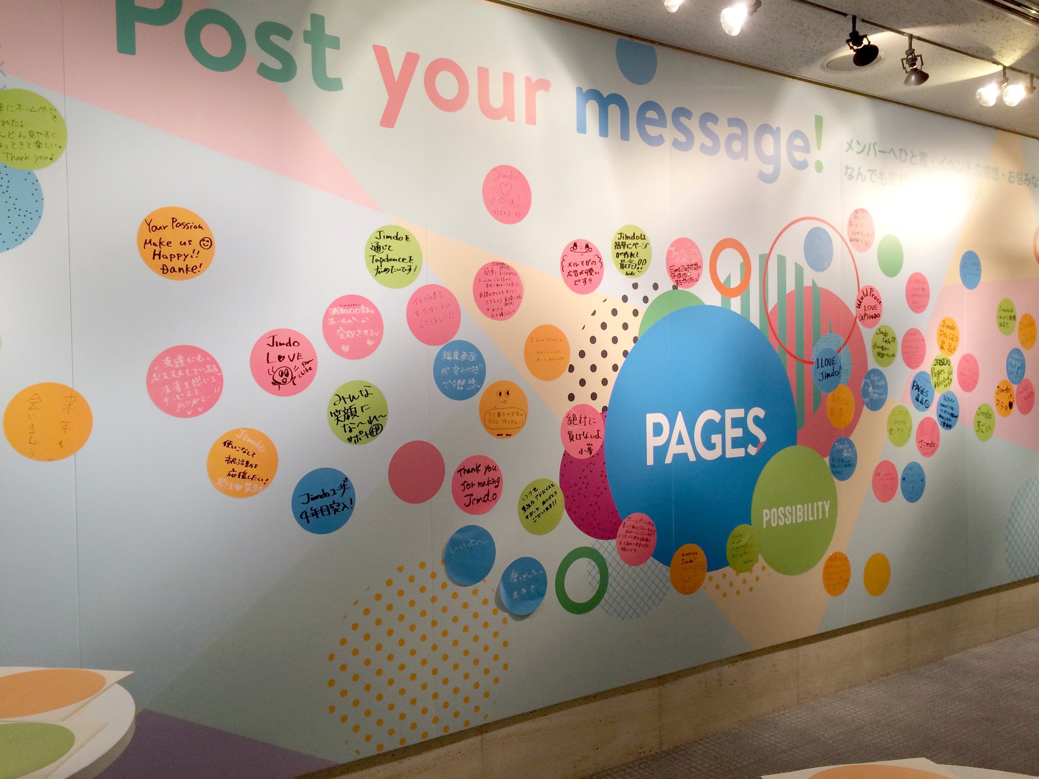 今回のPAGESでは、新たな「おもてなし」としてご来場のユーザーのみなさんにイベントの感想やJimdoでのお悩みなどメッセージを書いていただき、壁に貼ってもらう試みをしました。あたたかいメッセージも厳しいサービスへのご要望も一枚一枚目を通して、今後に活かしていきたいと思います。