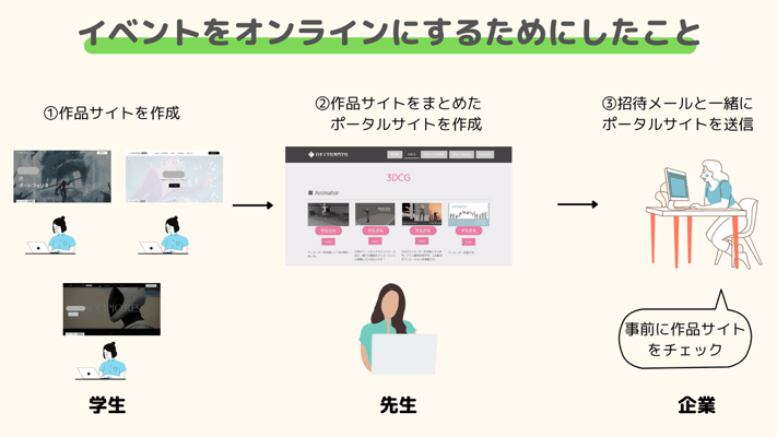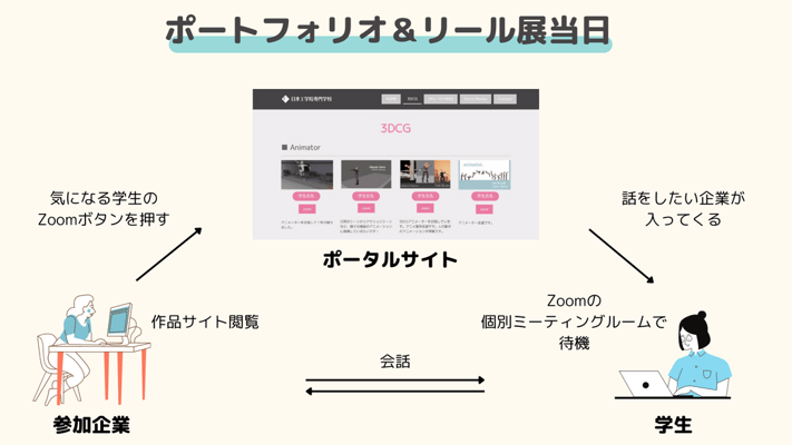 就活イベントの開催ができない中で「学生の就職活動を今までのようにサポートするにはどうしたらいいのか…」と、担任の先生がひらめいたのが、開催が難しくなった「ポートフォリオ&リール展」を自分たちでオンラインで実施することでした。