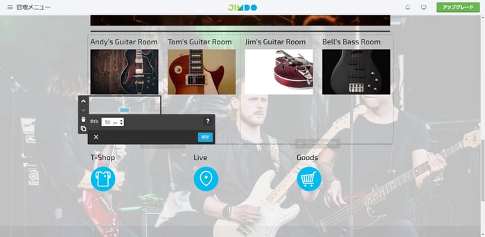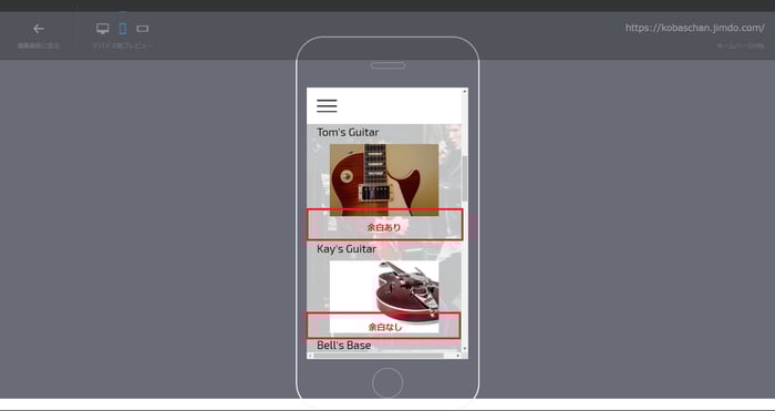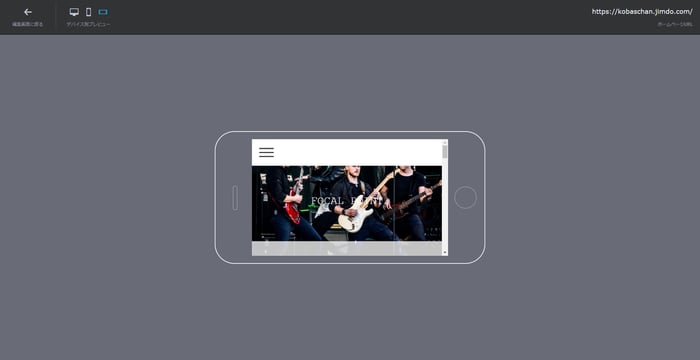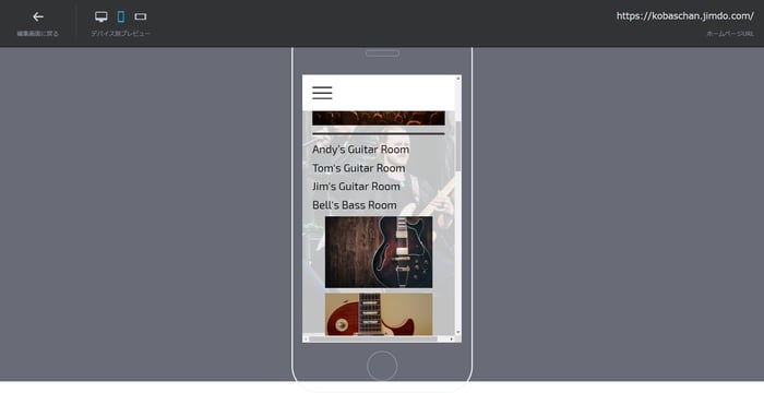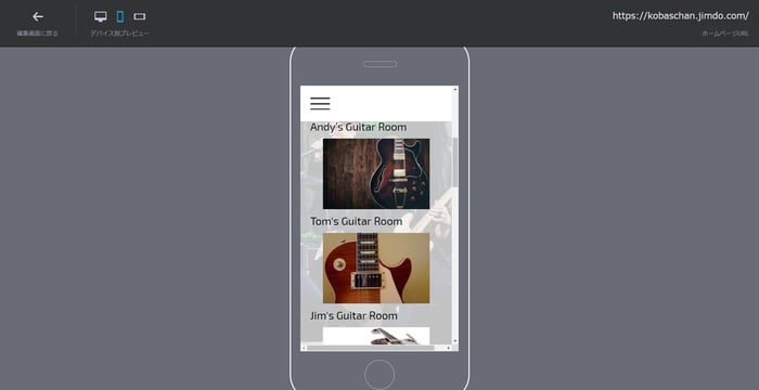 Jimdoで制作したページをパソコンのウェブブラウザーで表示し、ウインドウサイズをスマホサイズくらいに縮めてみるとその様子がよくわかります。