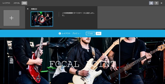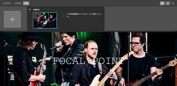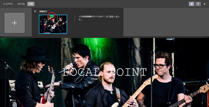 背景画像を読み込んだ際に、なにも設定しなければ画像の中心にポイントが置かれます。画面左上、赤丸の中の白い丸がフォーカルポイントになります。このまま何も設定せずにパソコン版のプレビューを確認してみます。