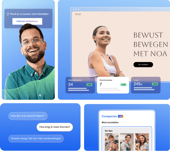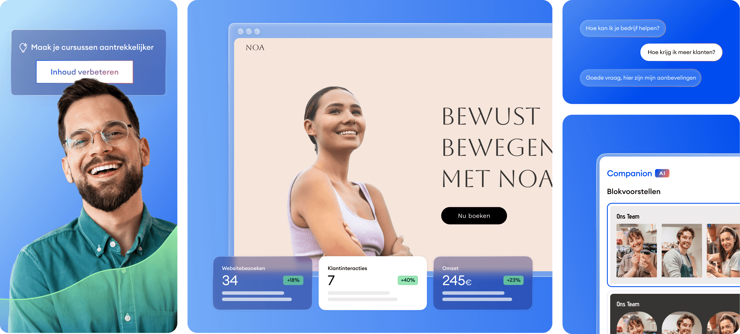 Jimdo bundelt alles wat je bedrijf nodig heeft: website, marketing, boekingen of een online shop. Met Companion heb je een slimme assistent die met je meedenkt: het begrijpt je bedrijf, laat zien welke stappen je kan nemen en helpt je die ook zetten. Voor meer zichtbaarheid, meer klanten en een vollere agenda.